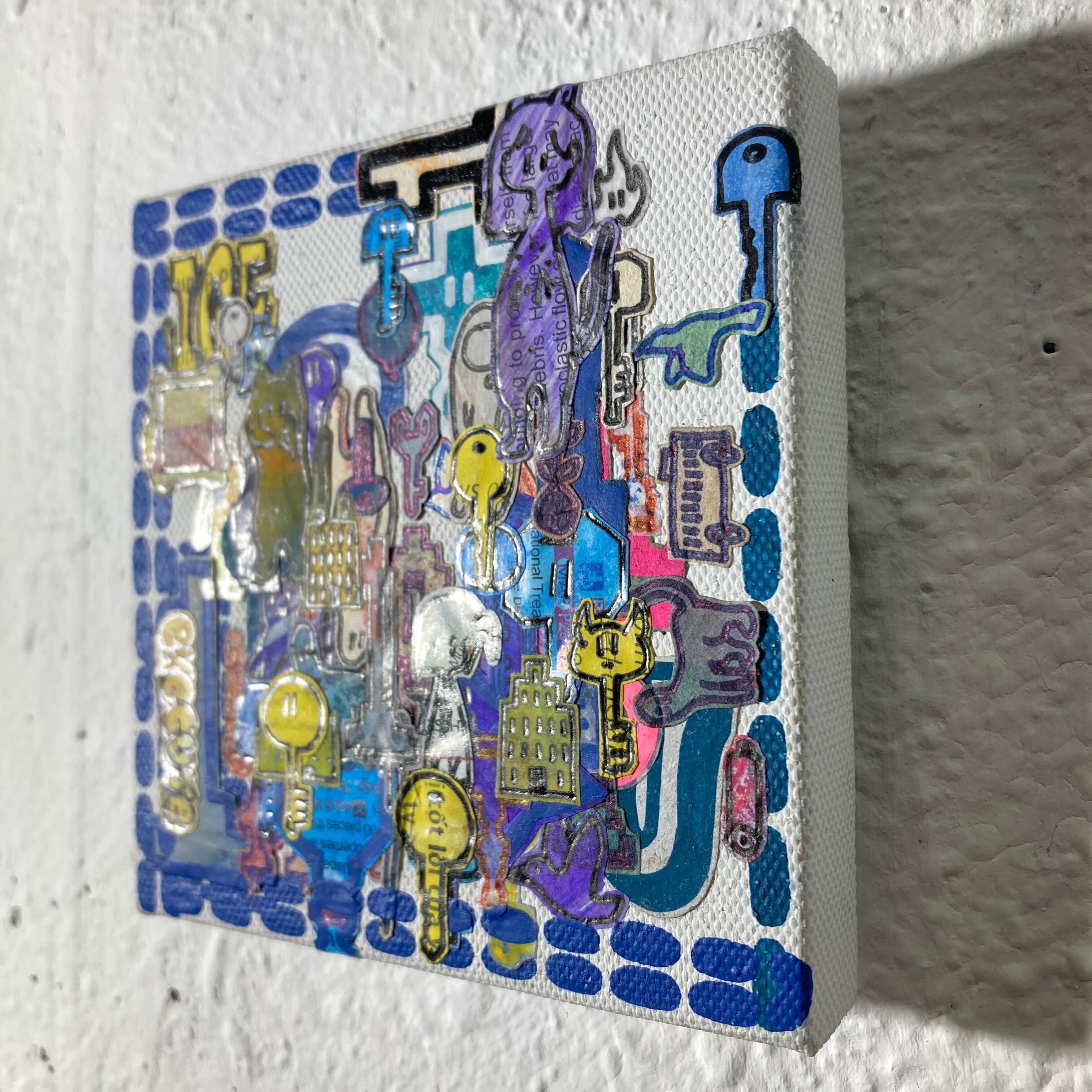 白いミニキャンバスを下地に、手描きのコラージュと、アクリル絵の具で構成されたオリジナルスタイルの可愛いキャンバス作品です。透明感と奥行きのある空間、色彩豊かな世界観を表現しました。明るい色合いと繊細なタッチが魅力的で、インテリアにぴったりです。