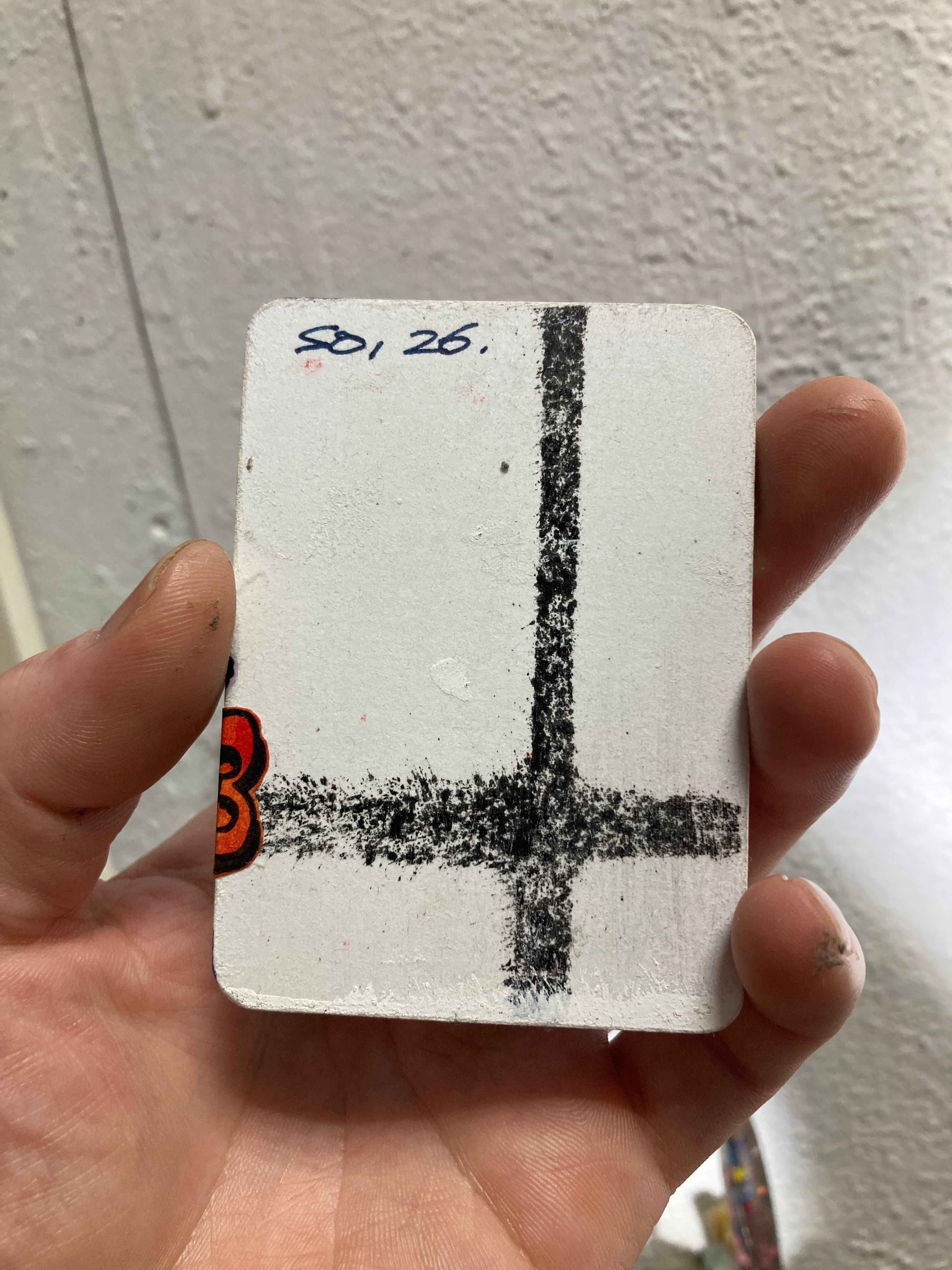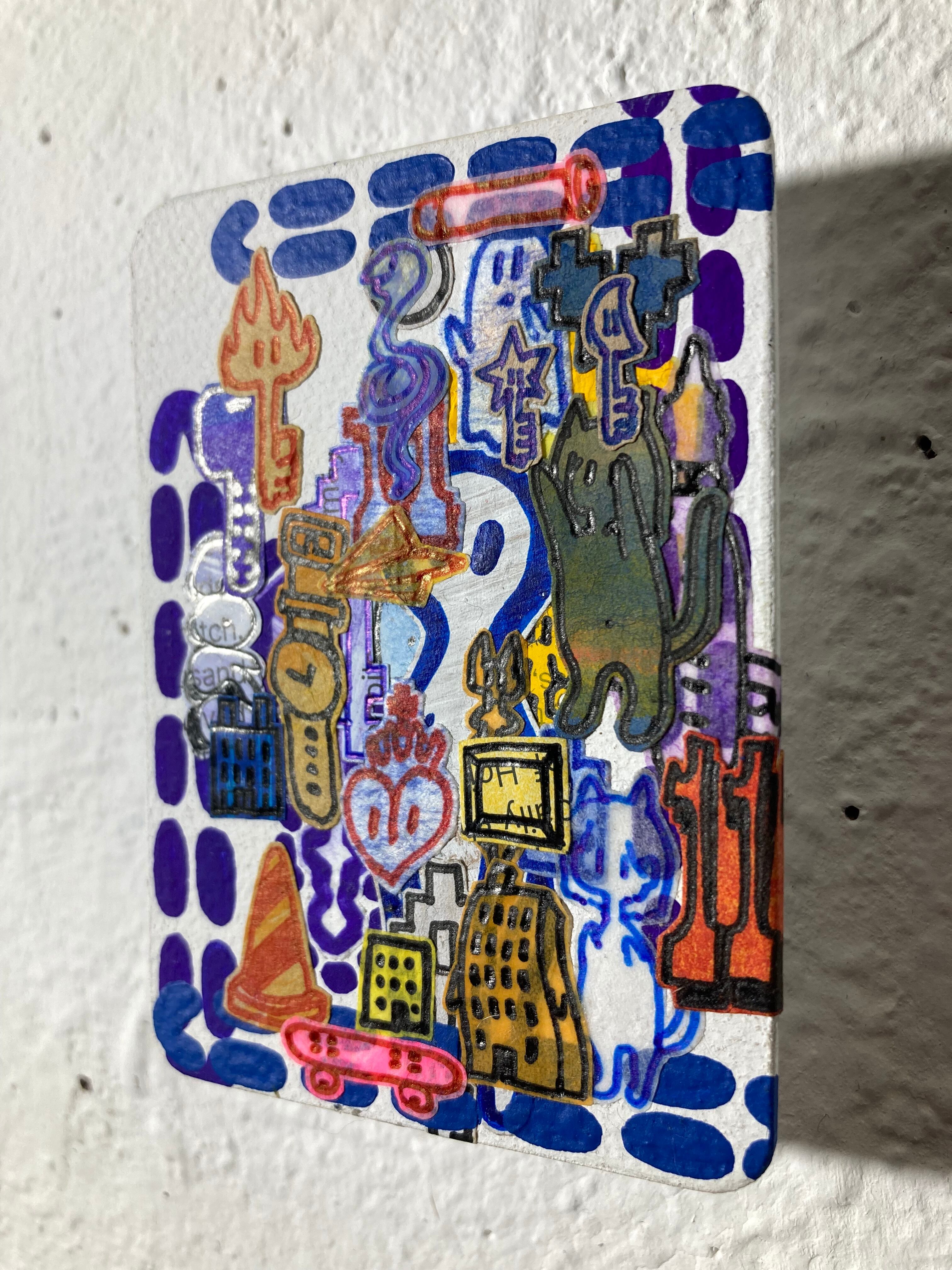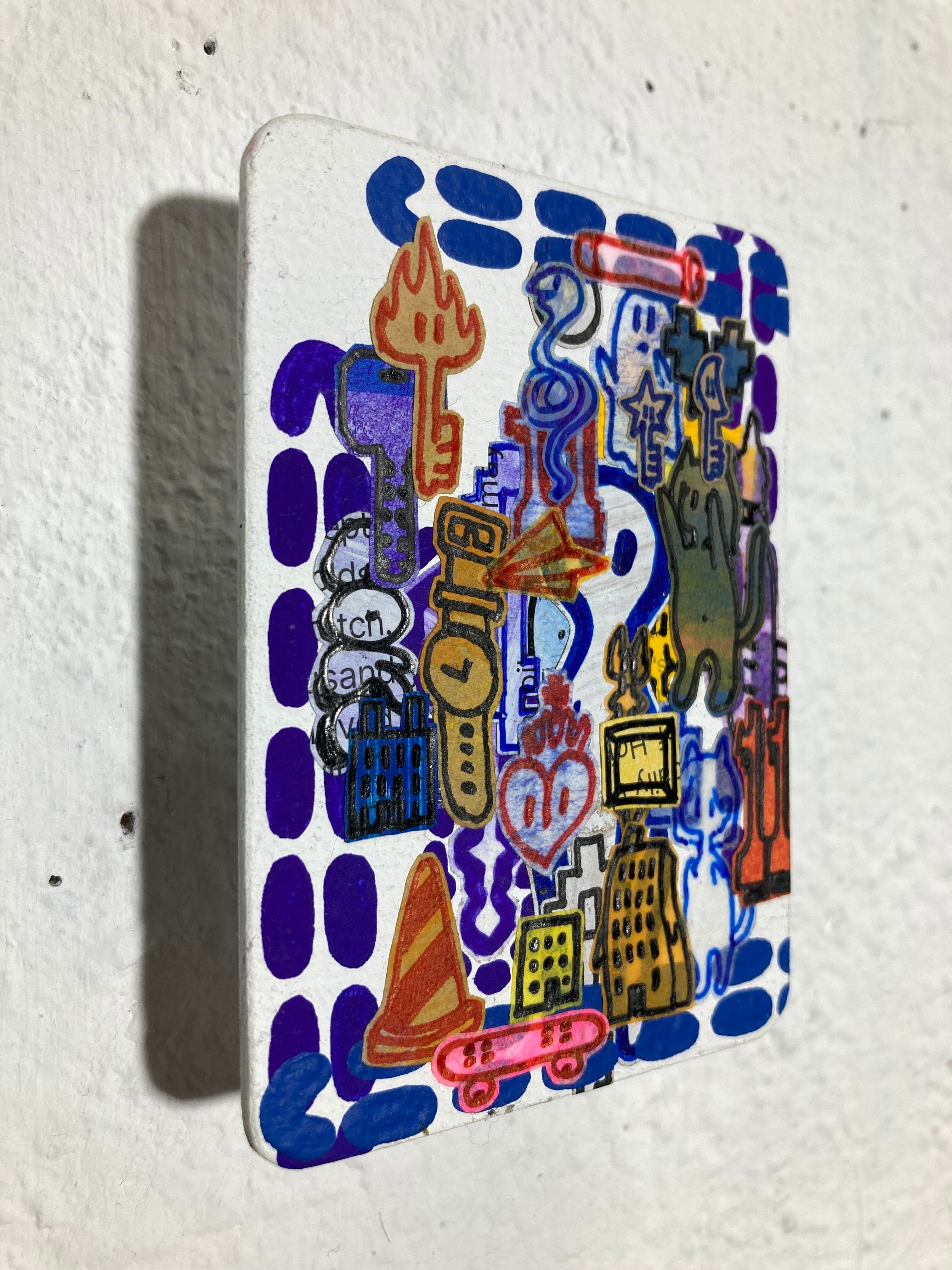 何層にもレイヤーを重ねて奥行きと空間を生むスタイル。白をバックにしたカードサイズの小作品です。シンプルなスタイルでありながら、高い密度とエネルギーの溢れる作品。見る人に元気を与える様な絵を目指しています。