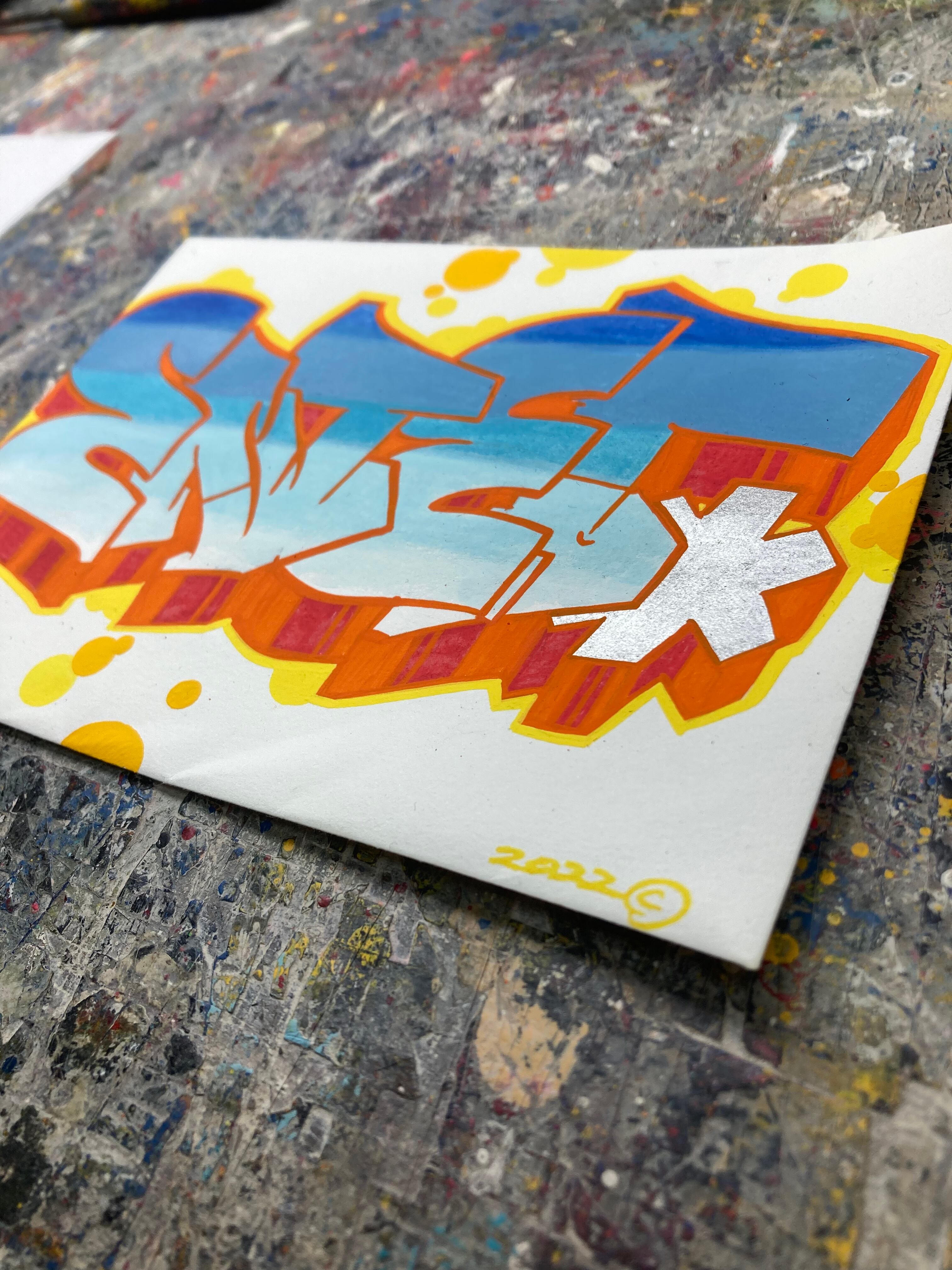 A work in which a letter used for graffiti is drawn on an envelope with paint. I plan to develop it as one series.